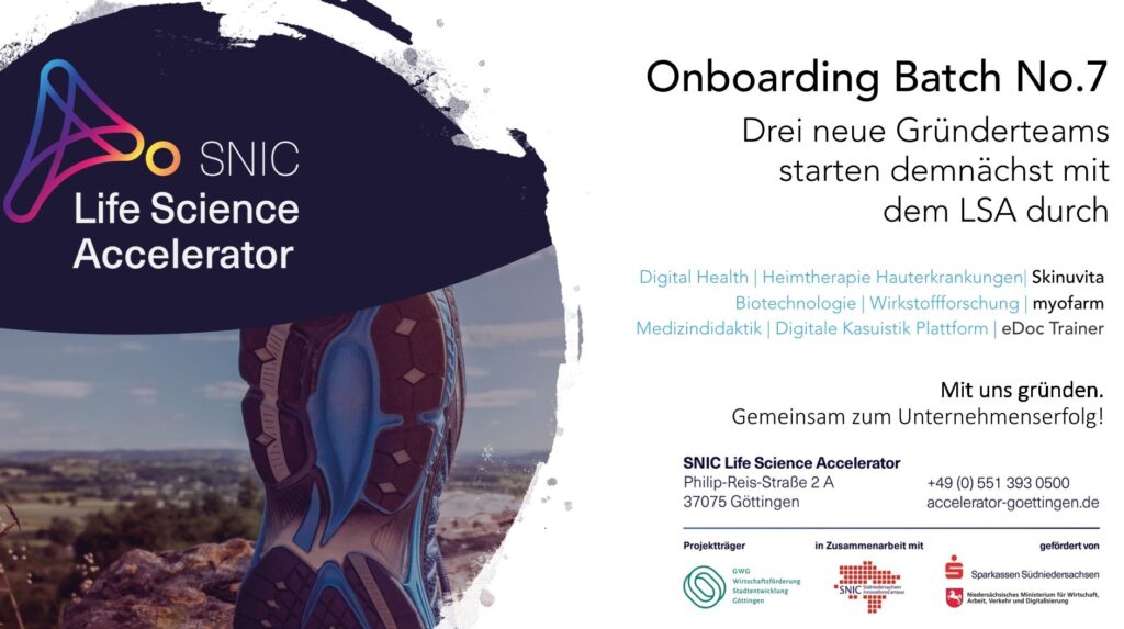 Mit Skinuvita, myofarm und eDoc Trainer starten ab Mitte September drei neue Startups in Batch No.7 mit dem Förderprogramm des SNIC Life Science Accelerator in Göttingen durch. Damit erhöht sich die Zahl der seit 2018 vom Accelerator geförderten Gründungsvorhaben auf 31.