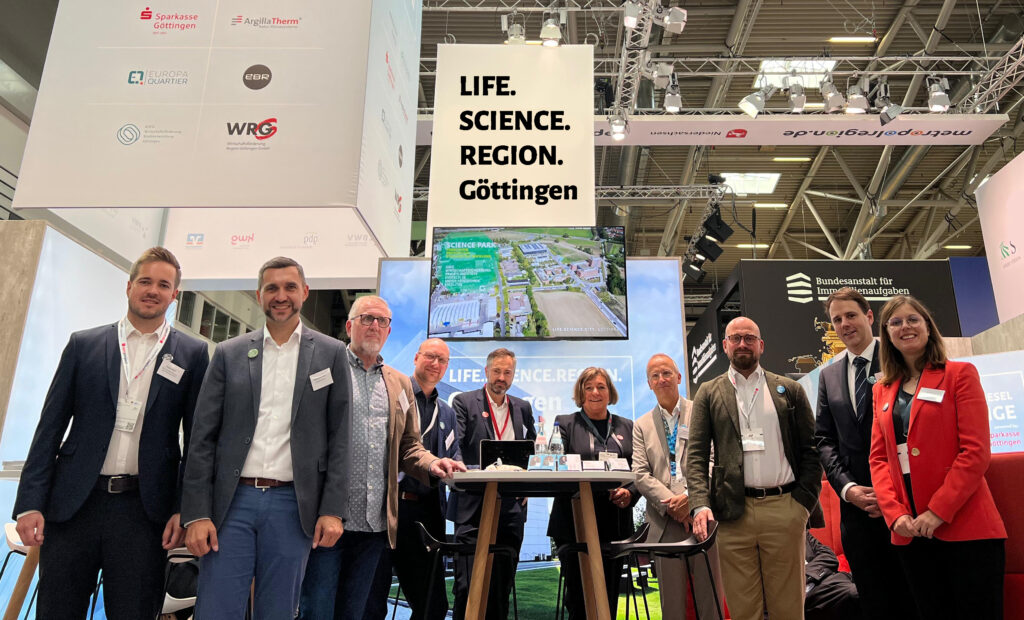 Mit Unterstützung der Sparkasse Göttingen, der Argillatherm GmbH und EBR Projektentwicklung GmbH beteiligte sich die Region Göttingen an der diesjährigen EXPO REAL. Dabei übernahmen GWG Gesellschaft für Wirtschaftsförderung und Stadtentwicklung Göttingen mbH und WRG Wirtschaftsförderung Region Göttingen GmbH die Vorbereitung und Umsetzung des Göttinger Messebereiches auf dem Metropolregion-Gemeinschaftsstand. Gemeinsam mit einer Delegation von Göttinger Unternehmensvertreter*innen präsentierte sich die LIFE.SCIENCE.REGION.Göttingen mit ihren vielfältigen Entwicklungsmöglichkeiten. Dabei wurden erneut viele Termine im Vorfeld vereinbart und spontan vor Ort mit langjährigen Partner*innen und potenziellen Investoren geführt. Themen wie Nachverdichtung, die Schaffung weiterer Gewerbeflächen oder von Wohnraum waren nur einige Aspekte, die bei den Gesprächen eine Rolle spielten. In Gesprächen mit Vertreter*innen aus Politik und Wirtschaft informierten sie auch über den Status quo derzeitiger Bauvorhaben.