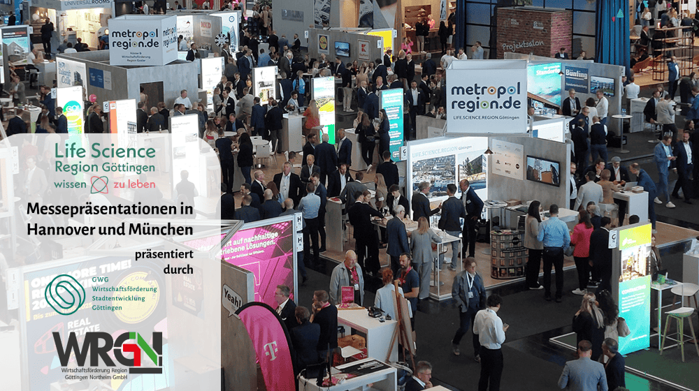 Nach erfolgreichen Präsentationen in den vergangenen Jahren planen WRGN & GWG mit regionalen Partner*innen auch in diesem Jahr die Entwicklungsmöglichkeiten der LIFE.SCIENCE.CITY.Göttingen auf wichtigen Messen für Immobilien und Investitionen zu präsentieren. Dabei übernehmen die Wirtschaftsförderungen der Stadt Göttingen und der Landkreise Göttingen und Northeim in enger Kooperation die Koordinierung, Organisation und Umsetzung.