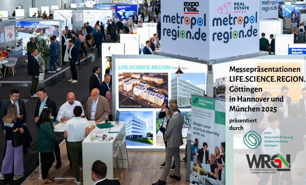 Nach erfolgreichen Präsentationen in den vergangenen Jahre planen WRGN & GWG in enger Kooperation mit regionalen Partner*innen auch in diesem Jahr die Entwicklungsmöglichkeiten der LIFE.SCIENCE.CITY.Göttingen auf wichtigen Messen für Immobilien und Investitionen zu präsentieren. Dabei übernehmen die Wirtschaftsförderungen der Stadt Göttingen und der Landkreise Göttingen und Northeim in enger Kooperation mit regionalen Partner*innen die Koordinierung, Organisation und Umsetzung.