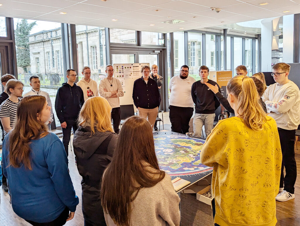 Die GWG lud dazu Auszubildende aus Göttinger Betrieben ein, an dieser ersten Spielrunde teilzunehmen. Der Spieleentwickler Matthias Mittelberger hat das Spiel gemeinsam mit einer Spielleiterin und einem Speilleiter durchgeführt.